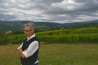 In vigna spiega che il Casentino è un territorio molto particolare, unico in Toscana e con il dito indica le due vette avvolte dalle nuvole oltre i 1.000 metri che sovrastano tale vallata dalla forma a V che consente una ventilazione particolare ed un'escursione termica di 4 gradi più ampia nei valori alti, sia in quelli bassi, rispetto alla Borgogna.